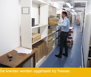Om de krantenleggers veilig te kunnen digitaliseren wordt de schade gestabiliseerd in ons atelier.